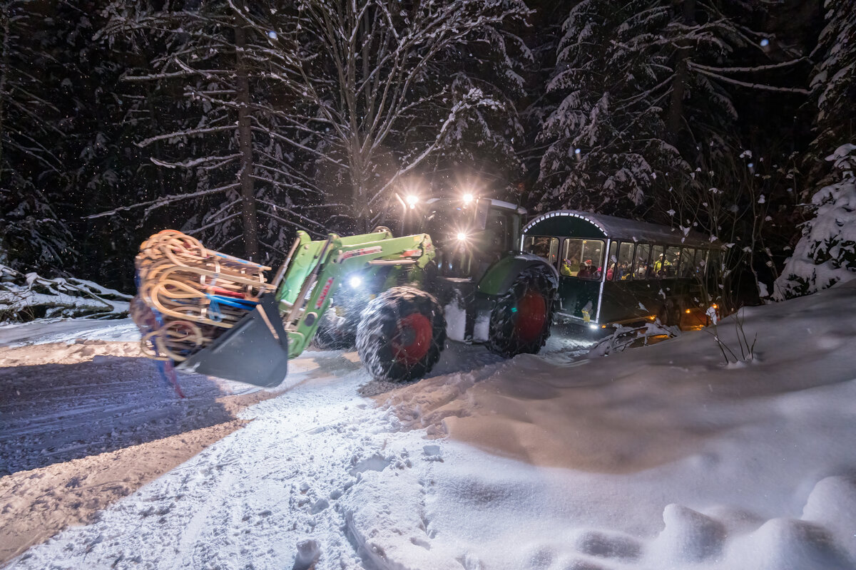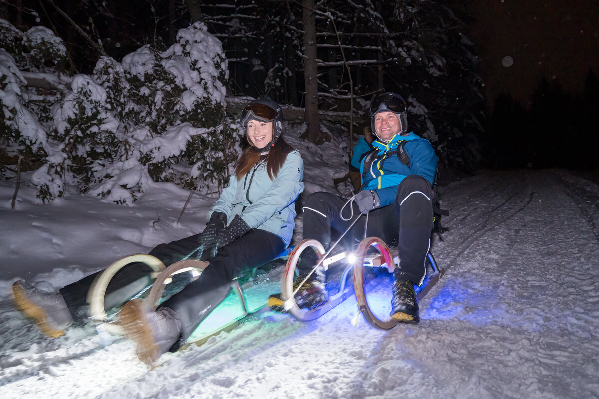 Für das Nachtrodeln werden regelmäßig geführte Termine angeboten. Mit dem Traktortaxi geht es zunächst bequem hinauf zur Unterwirt Hütte auf rund 1.700 m Seehöhe. Nach einer kurzen Einführung startet die etwa 7 km lange, beleuchtete Abfahrt ins Tal.